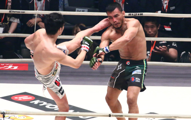 朝倉の左ミドル、ハイと多彩な攻撃を受けるマカパだったが、全く退く様子を見せなかった