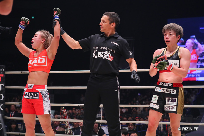 勝ち名乗りを受け喜ぶソヒ、称える浜崎