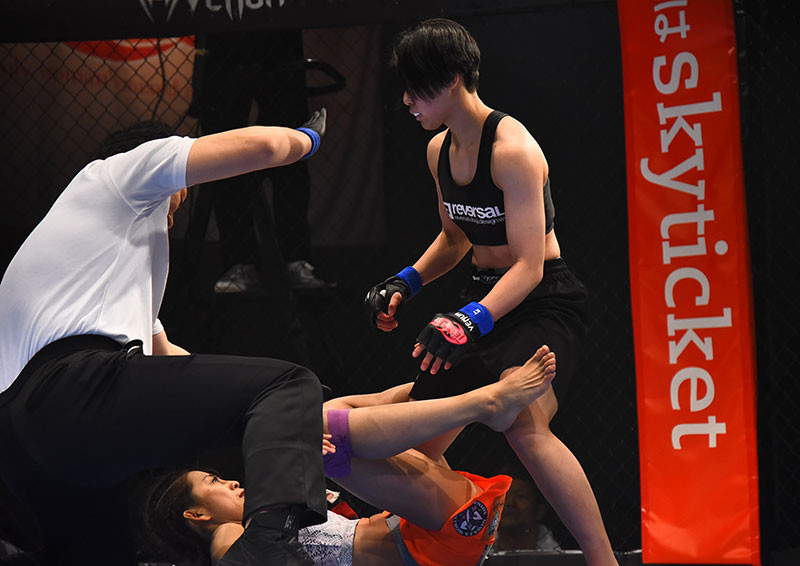 井上が仰向けにダウンしレフェリーストップとなった瞬間