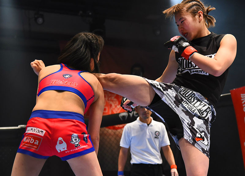 ミドルキックを蹴り込む永尾