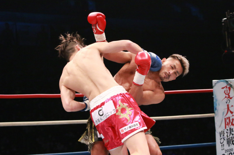 レオナの打ち下ろしの右が村越のアゴにクリーンヒットする