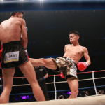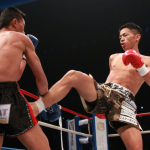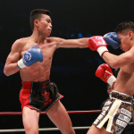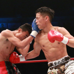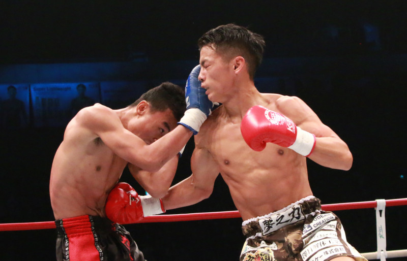 武居(右)は1R、左フックからボディ連打で追い詰めるが、以降、デンサヤームもペースを握りはじめる