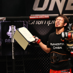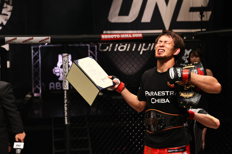 勝利し、ベルトを巻かれた岡田は万感の表情(C)SUSUMU NAGAO/SUSTAIN