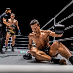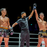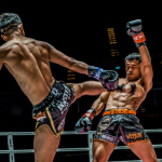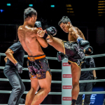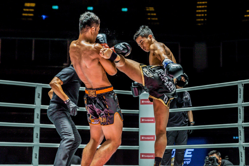 スーパーボン(右)が威力ある蹴りを放つ