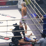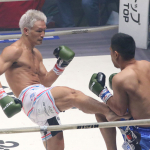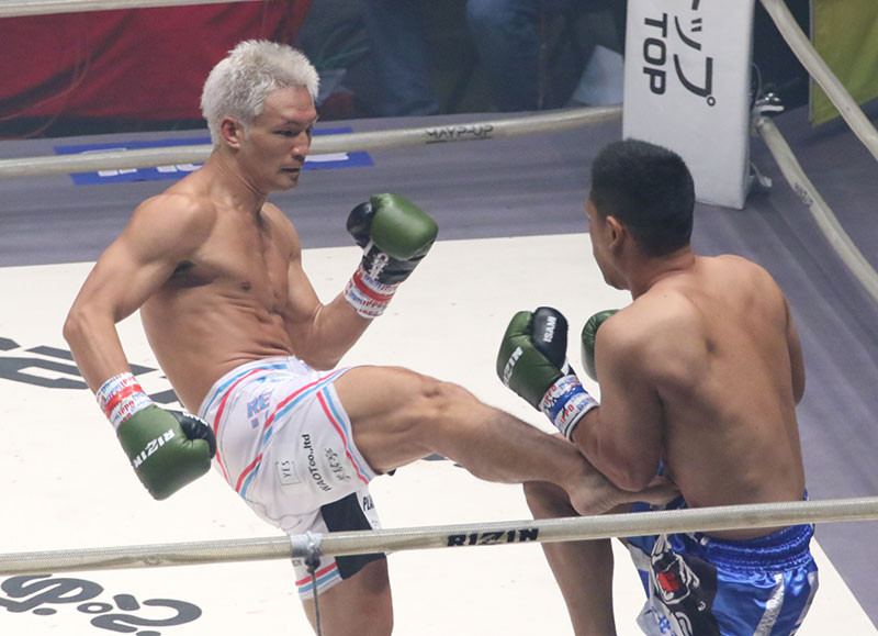 ミドルキックを放つ松倉