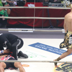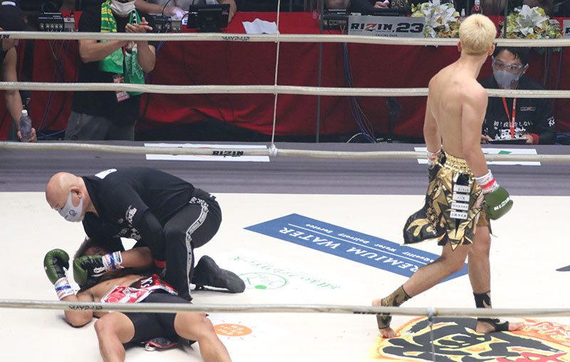 原口の強打でマットに沈んだ大雅(左)
