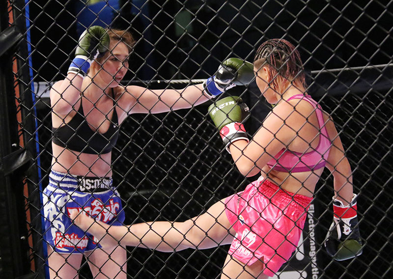 ローキックで攻めるレイナ