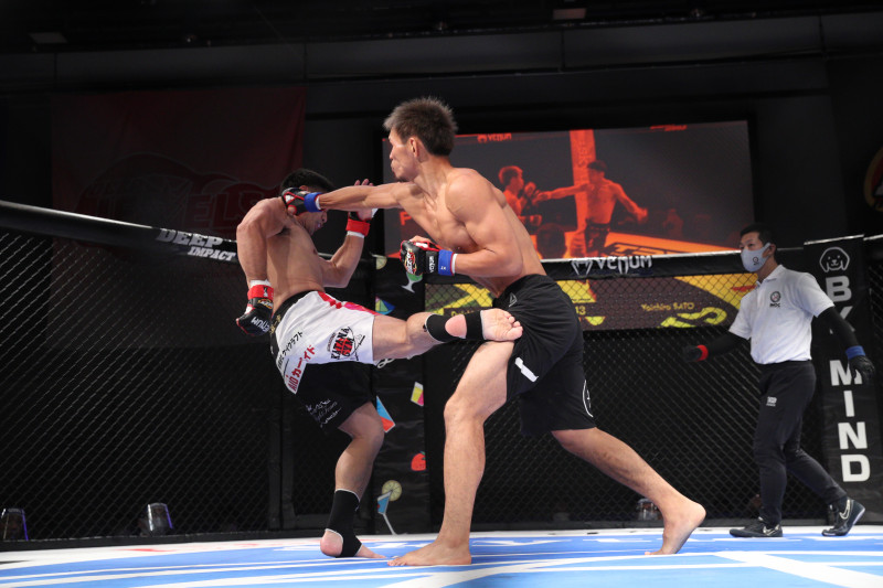 佐藤のローと阿部のパンチが交差する 写真提供:DEEP事務局