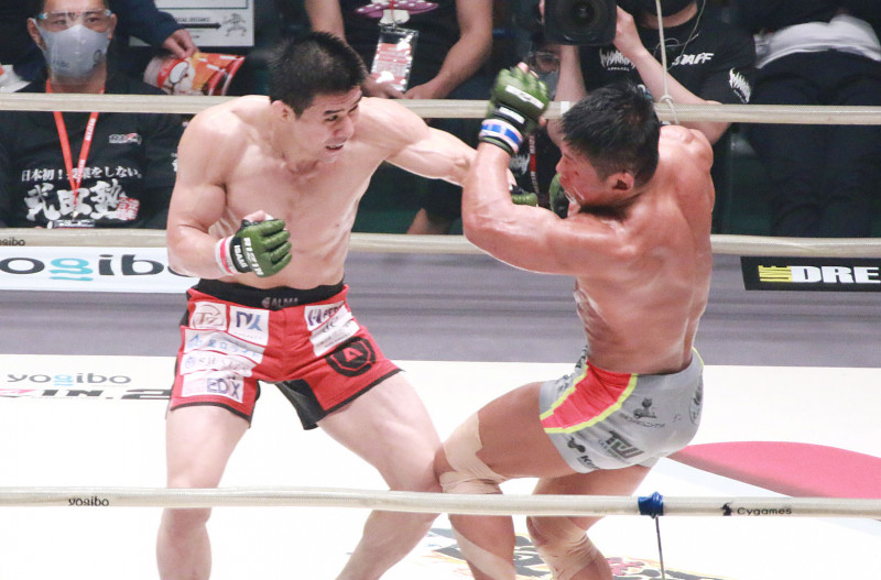 久米がパンチをヒットさせ北岡をグラつかせる
