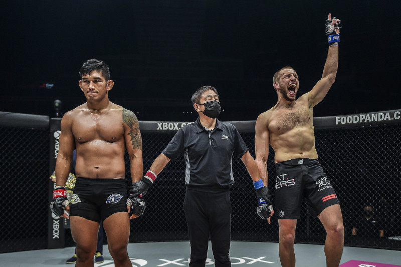 デ・リダー(右)が勝利し新王者に。王座陥落したンサン(左)は唇を噛み締めた(c)ONE Championship