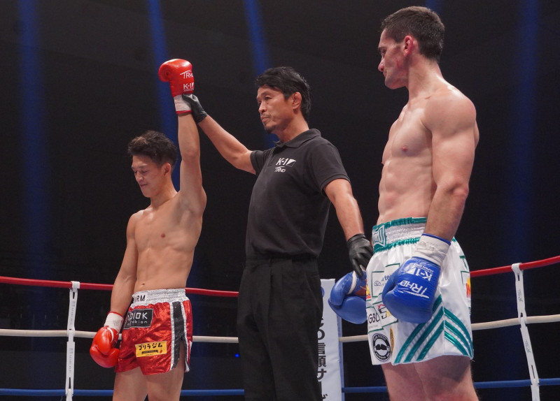 無念の表情で勝ち名乗りを受ける野杁