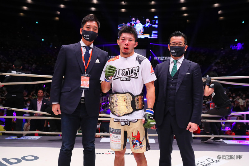 ベルトを巻いた斎藤。激闘で顔が赤く腫れている