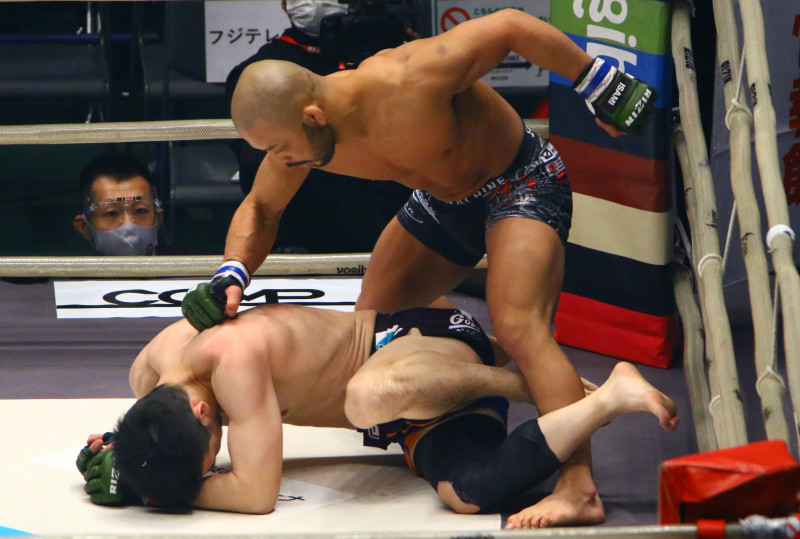 容赦ないパウンドを落とし続ける倉本
