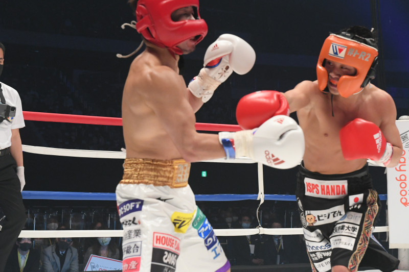 京口(右)の右ストレートが八重樫にクリーンヒット©LEGEND