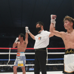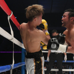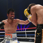 比嘉の猪突猛進な攻撃に井上が的確にパンチをヒットさせる©LEGEND