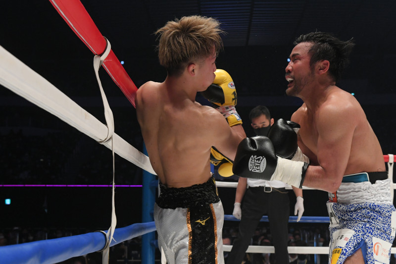 3R、井上のアッパーの連打がヒット、比嘉の顎が上がる瞬間©LEGEND