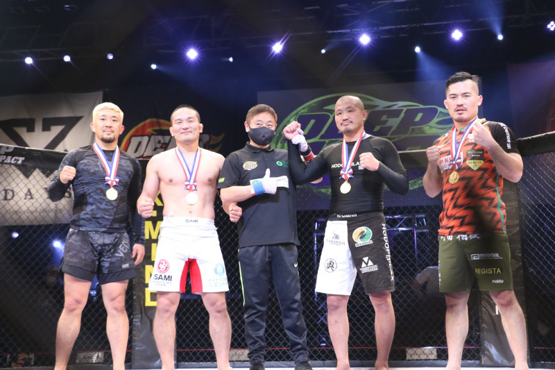 DEEP 100回記念グラップリングタッグマッチが行われた。左から廣田、菊野、島田レフェリー、横田、松本