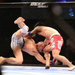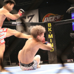 カーフキックを放つ藤田(右)