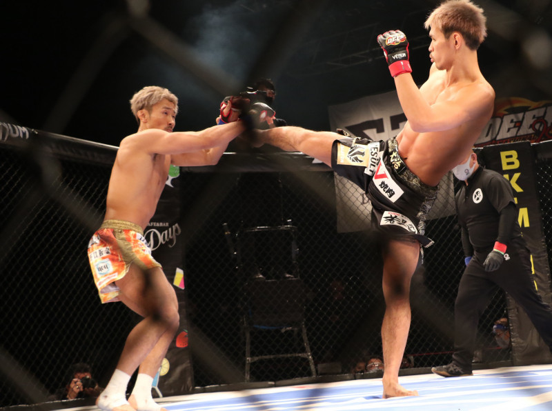 阿部(右)の蹴りを手で受けるレッツ(左)