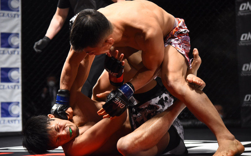 パウンド連打で岩本達彦(下)を追い込む中田大貴(上)
