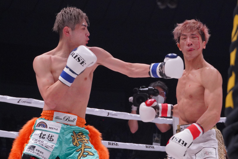 強烈な左フックをヒットさせる奥平(左)