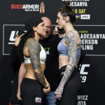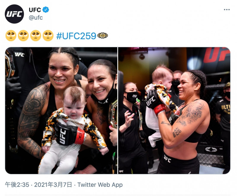 オクタゴンに愛娘を入れて勝利を喜ぶヌネス(UFC公式SNSより)