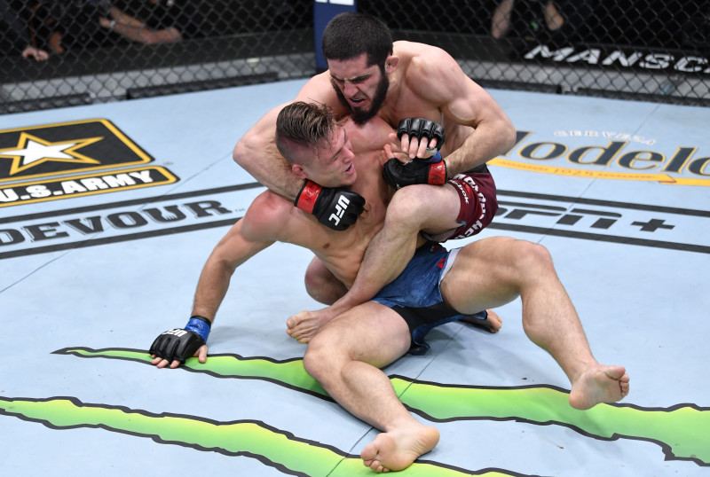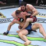 バックからサブミッションを仕掛けようとするマカチェフ(右)(©Getty Images/UFC)