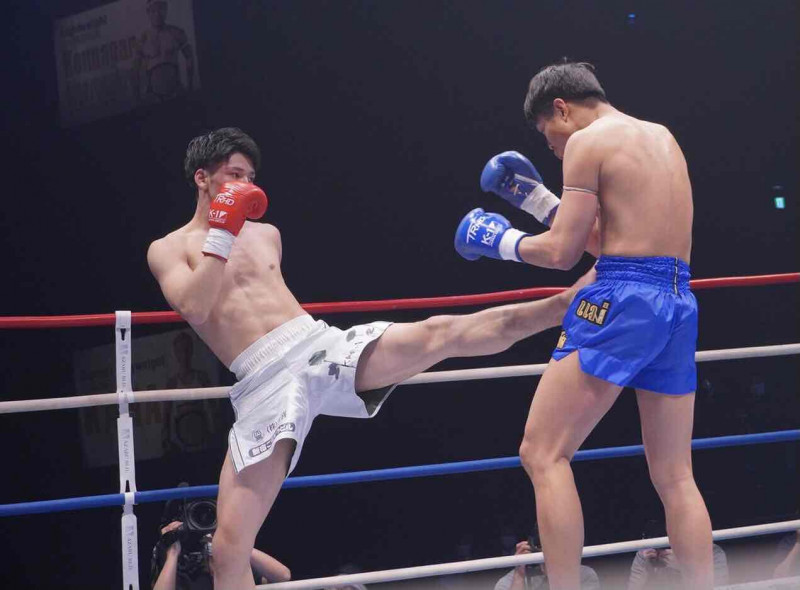 前蹴りで打ち合いを牽制する近藤 右拳の調子が良くなかったのか