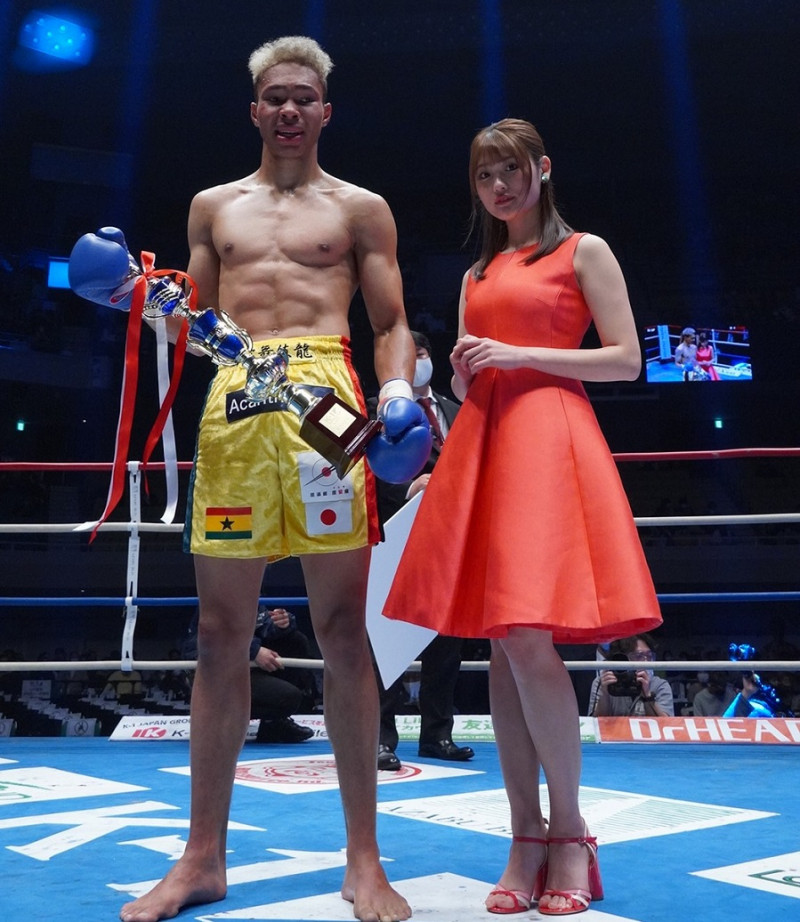 寧仁太と、ラウンドガールを務めた石田桃香(右)