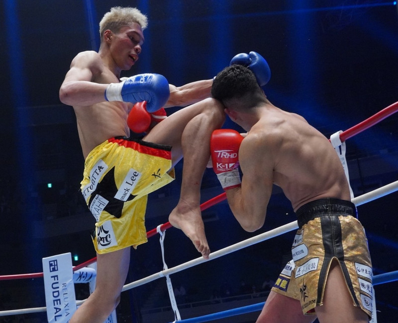 飛びヒザ蹴りを当てる寧仁太