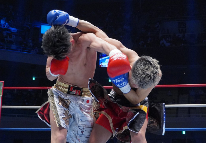 横山(左)のクロスカウンターが佑典のテンプルにヒットした瞬間、わずか29秒のKO勝利となった