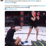 前日の公開計量&フェイスオフ、対戦するグラフと並び、白のボディコン姿でマッスルポーズを決めるロシア美女戦士アヴサラゴワ(左)©️Bellator