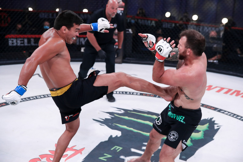 序盤、空手の蹴りと間合いで試合を優位に運ぶマチダ(左)©️Bellator