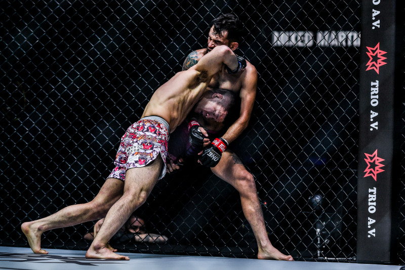 ケージに押し込む上久保(左)©️ONE Championship