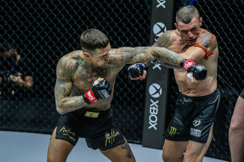 カウンターの左フックをヒットさせるホルツケン(左)(C)ONE Championship