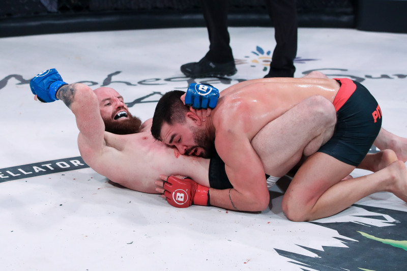 グラウンド状態で下から、ヒジを叩き込むクアリー(左)©️Bellator