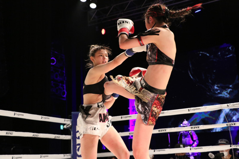 AKARI(左)の右ストレートに寺山がミドルを蹴り込む