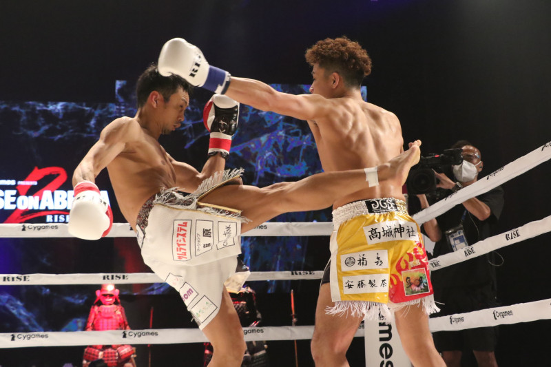 パンチを振るKENTAに距離を明け渡さずペースを握った麻原