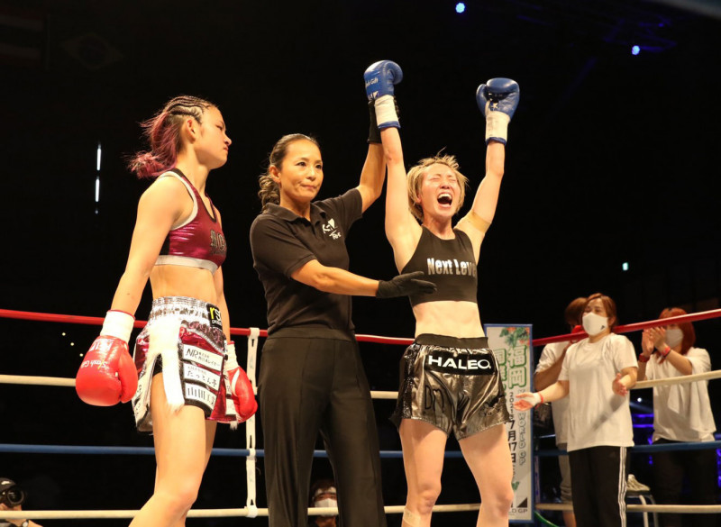 勝ち名乗りを受け、両手を上げて喜ぶ優
