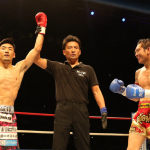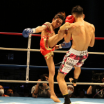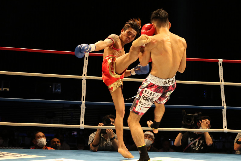 肩越しに強烈な右ミドルを受ける佐々木