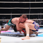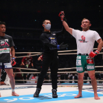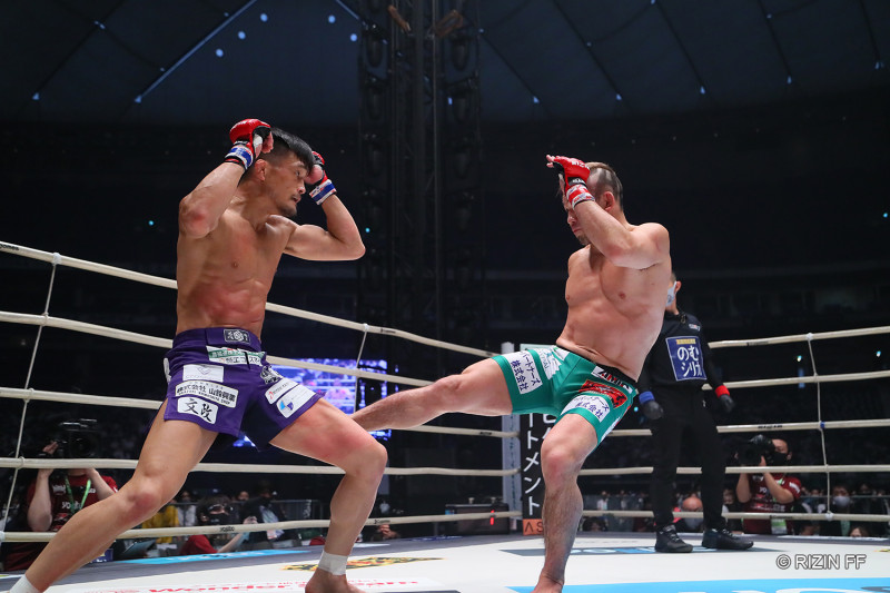 扇久保の強烈なキックに、春日井(左)の腿が赤く腫れ上がる