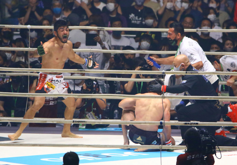 一本勝ちで王者になり、歓喜するサトシ(左)