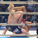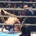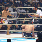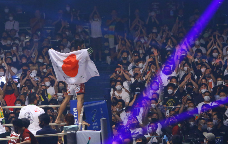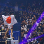 日本の国旗を背に、観客の声援に応えるサトシ