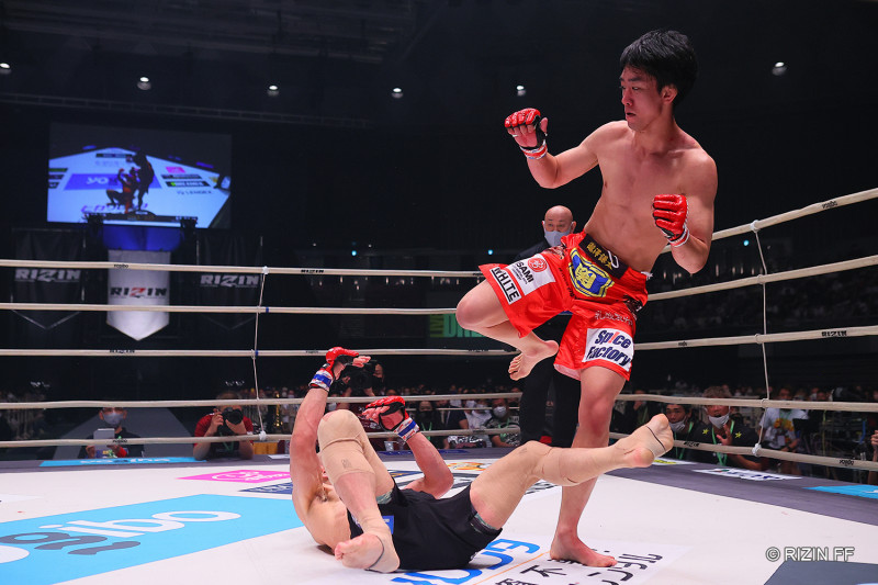 後ろ回し蹴りを浴びて倒れる今成