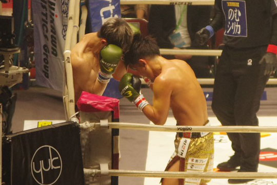 接近戦の中でバッティングにより試合中断に