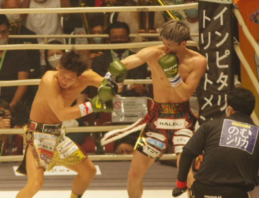 白鳥の右フックが皇治(左)にヒット