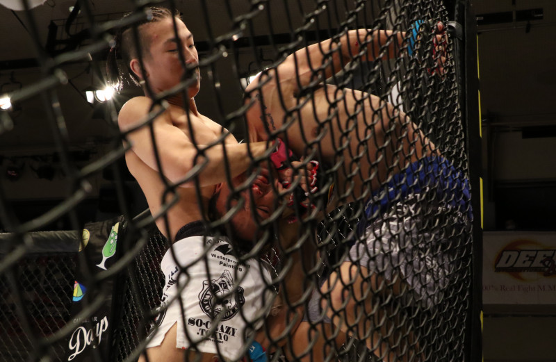 ギロチンチョークで絞り上げる鶴屋