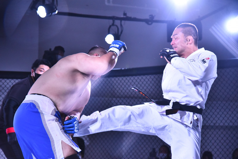 前蹴りで野尻を突き放す菊野