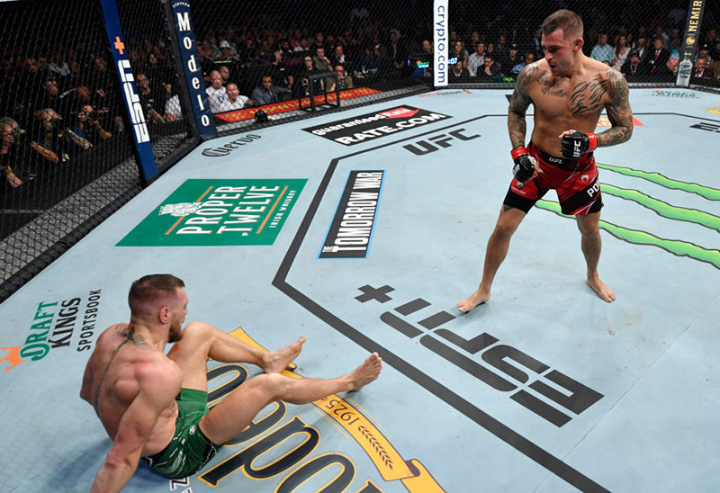 マクレガーがスネの下部がぐにゃりと曲がり骨折したようで立ち上がれず、ポイエーが勝利した(C)Getty/UFC
