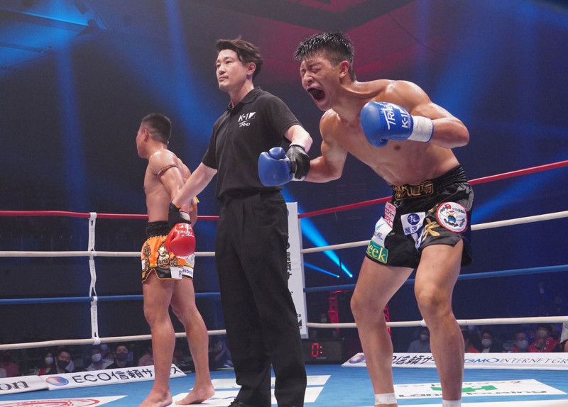 勝利の雄叫びをあげる朝久(右)